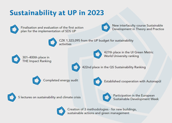 In 2023, the first action plan for the implementation of the Sustainable Development Strategy of Palacký University (SUR UP) was completed and evaluated. The new interfaculty course Sustainable Development in Theory and Practice provided students with a broader overview of various areas related to sustainability. The University received CZK 1 323 095 from its own budget to support sustainable activities. In international comparisons, the University was ranked 427th in the UI Green Metric, between 301st and 400th in THE Impact Rankings and 422nd in the QS Sustainability Ranking. An important milestone was the establishment of cooperation with Autonapul and the completion of an energy audit. In terms of awareness raising, 5 lectures on sustainability and the climate crisis were organised, the University participated in the European Sustainable Development Week and developed 3 new methodologies for buildings, sustainable actions and green management.