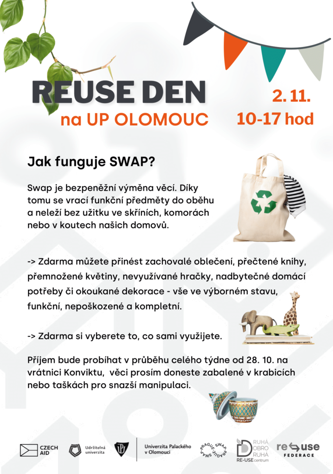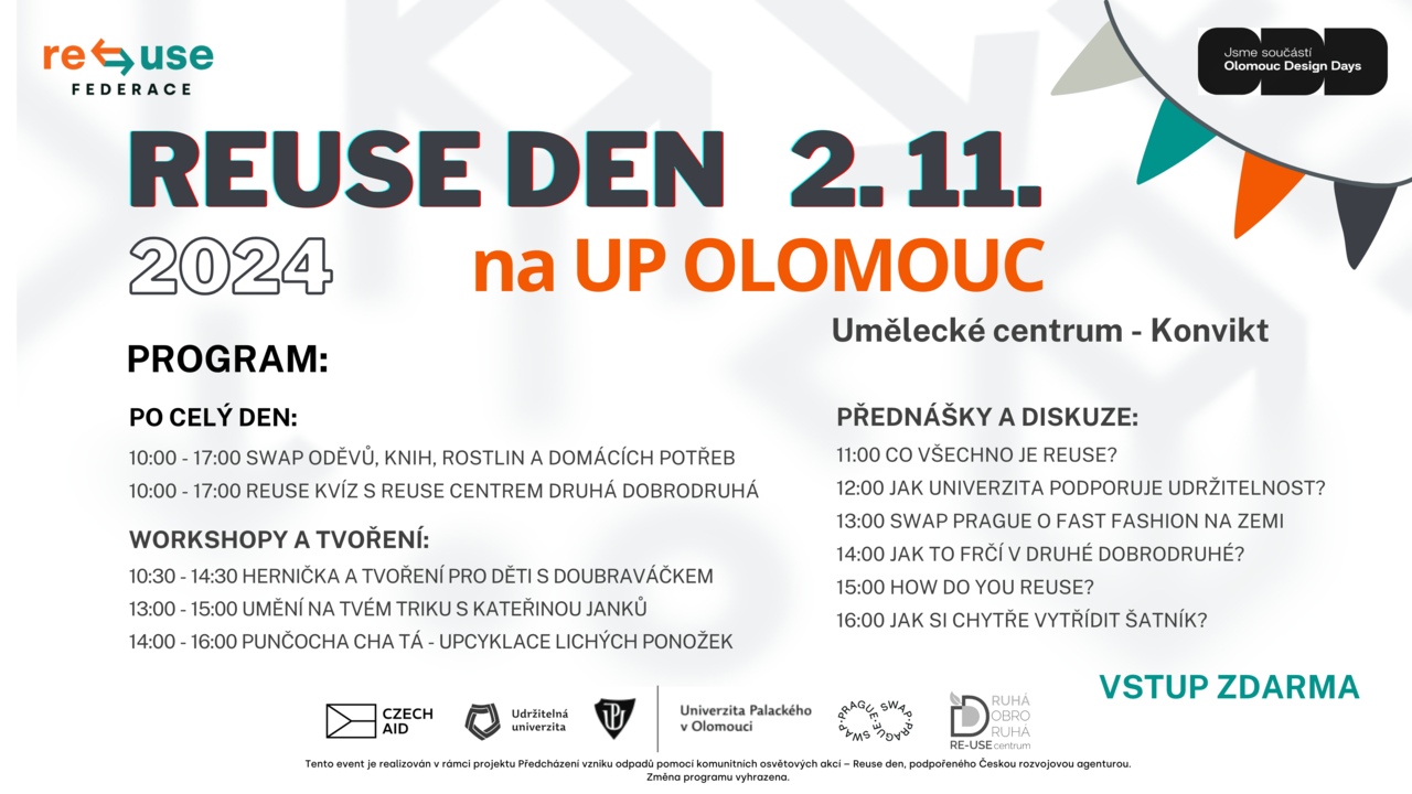 Nejlepší odpad je ten, který nevznikne. Jak najít starým věcem další využití nebo jak je přetvořit v něco zcela nového? Univerzita Palackého v Olomouci (Udržitelná univerzita) a Česká federace nábytkových bank a reuse center pořádají v sobotu 2. listopadu Reuse den na UP, během nějž se bude veřejnost moci zdarma zúčastnit kreativních workshopů na téma využití odpadu jako zdroje k tvorbě a upcyclingu. Akce dále nabídne přednášky o fast fashion a prevenci vzniku odpadu nebo velký swap, tedy bezplatnou výměnu předmětů mezi návštěvníky. Reuse den je součástí programu Olomouc Design Days.