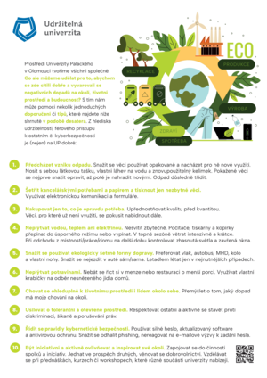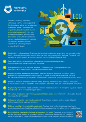 Prostředí Univerzity Palackého v Olomouci tvoříme všichni společně. Co ale můžeme udělat pro to, abychom se zde cítili dobře a vyvarovali se negativních dopadů na okolí, životní prostředí a budoucnost? S tím nám může pomoci několik jednoduchých tipů či doporučení, která najdete shrnutá v podobě desatera udržitelnost, sociální odpovědnosti, rovnoprávnosti či kybernetické bezpečnosti.